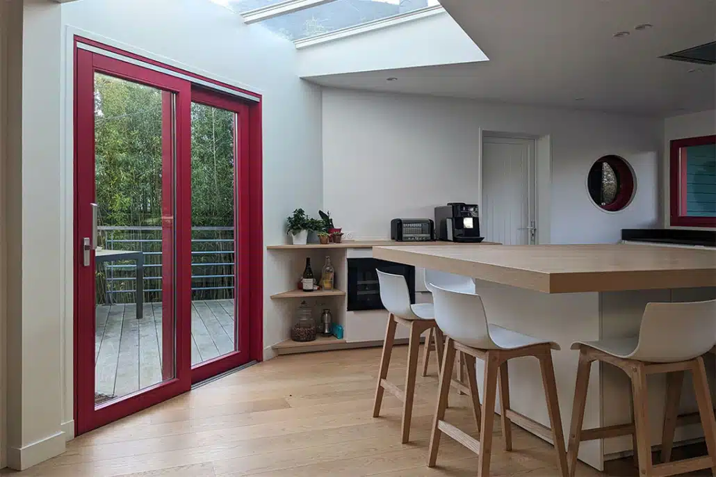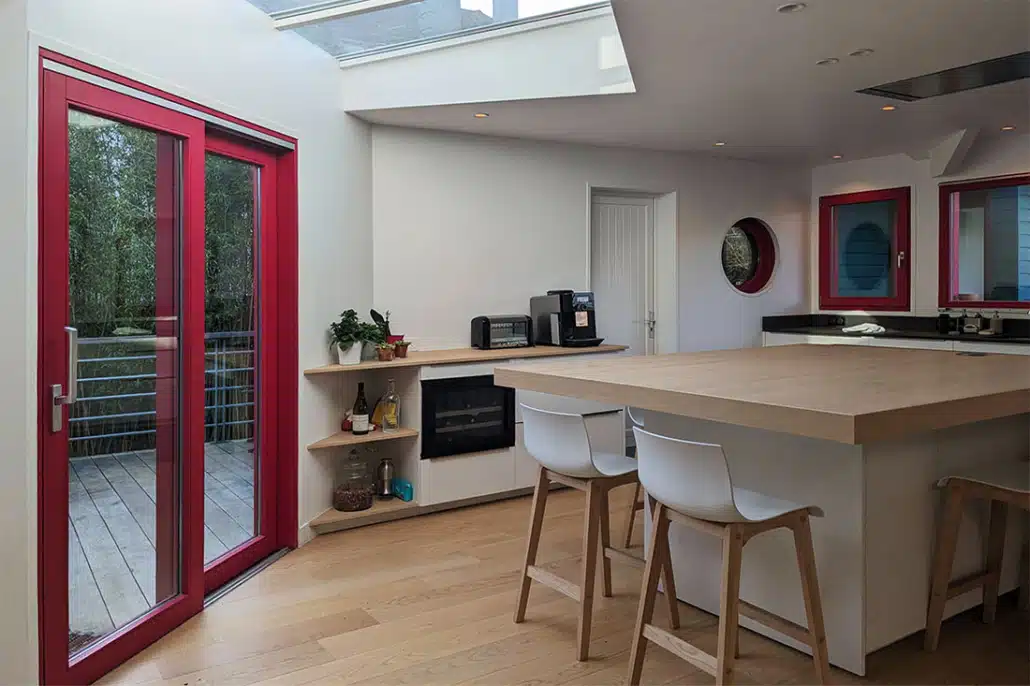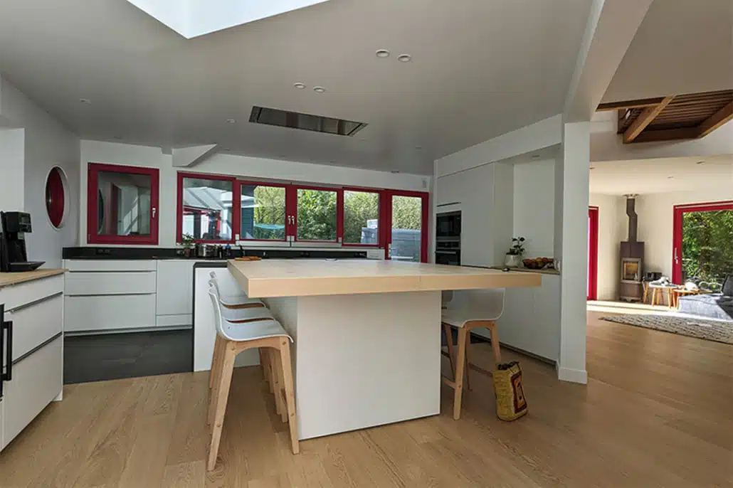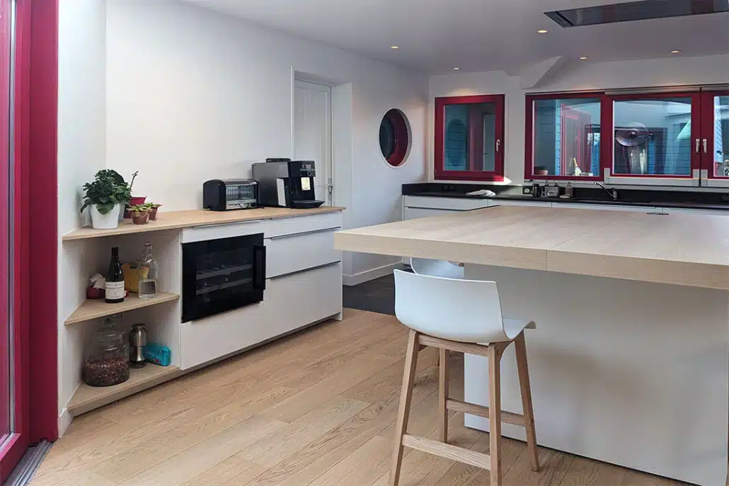• La couleur des meubles de cuisine et des murs sera très claire, le sol sera en chêne massif sur la totalité du rez-de-chaussée, avec un peu de carrelage devant l’évier. Tout est mis en œuvre pour épurer l’ensemble.