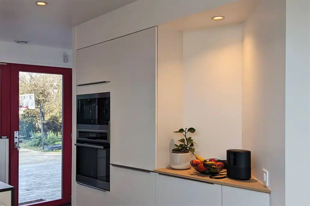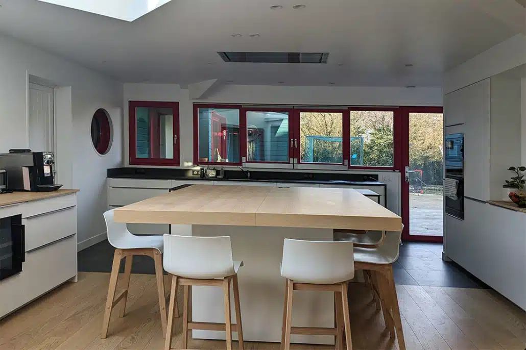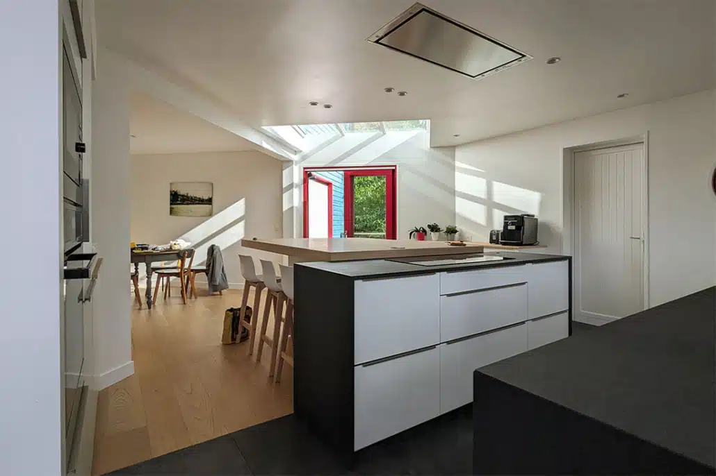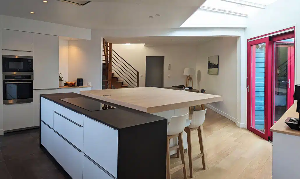 A présent que les travaux sont finis, les clients sont passés du rêve à la réalité et disposent d’un espace de vie ouvert et convivial, une grande cuisine sous verrière baignée de lumière avec des vues traversantes sur leur beau jardin et de 2 salles de bains modernes et fonctionnelles.