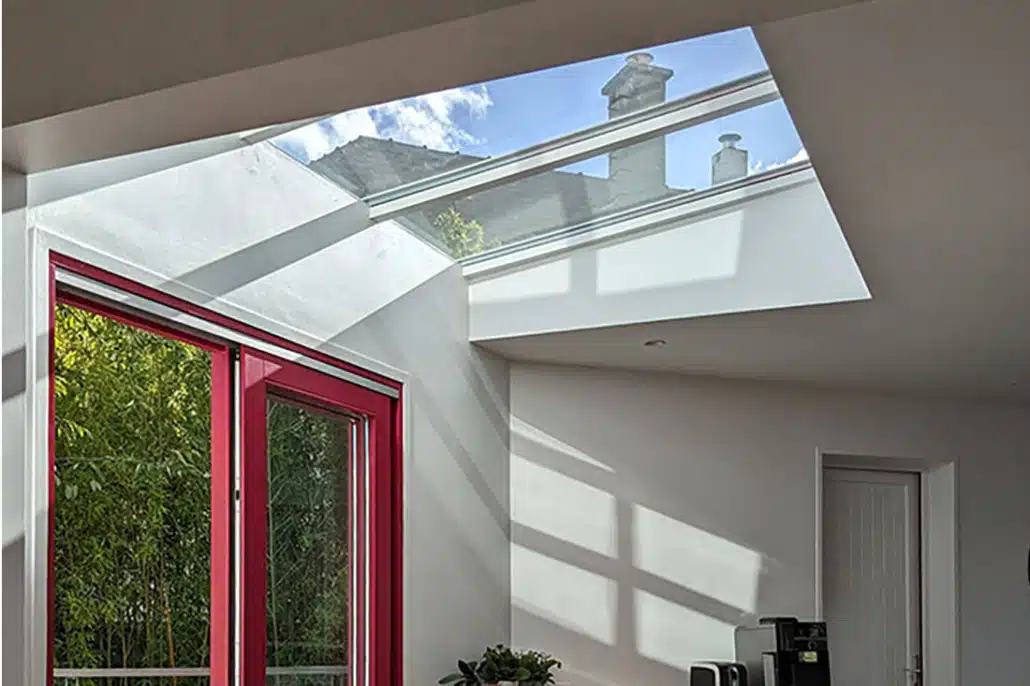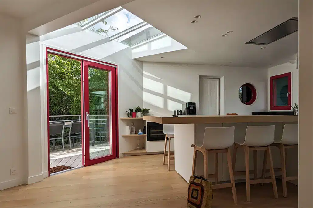 • Réaliser une extension sur une de leur terrasse mitoyenne  à la cuisine (la maison comporte plusieurs terrasses) et ouvrir sur la salle à manger afin de disposer d’un bel espace de vie. La maison est à ossature bois, nous garderons ce matériau pour l’extension qui aura un accès direct à la terrasse. Une partie de la toiture de l’extension sera vitrée (verrière), ceci pour apporter le plus de lumière possible et pour profiter des vues sur la nature environnante.