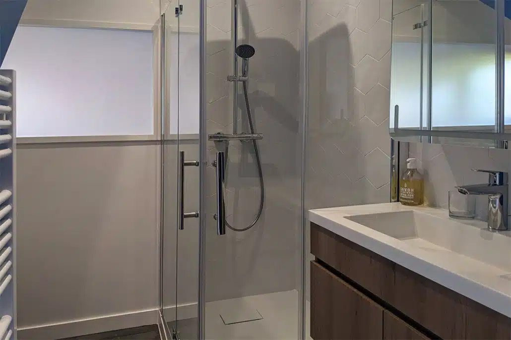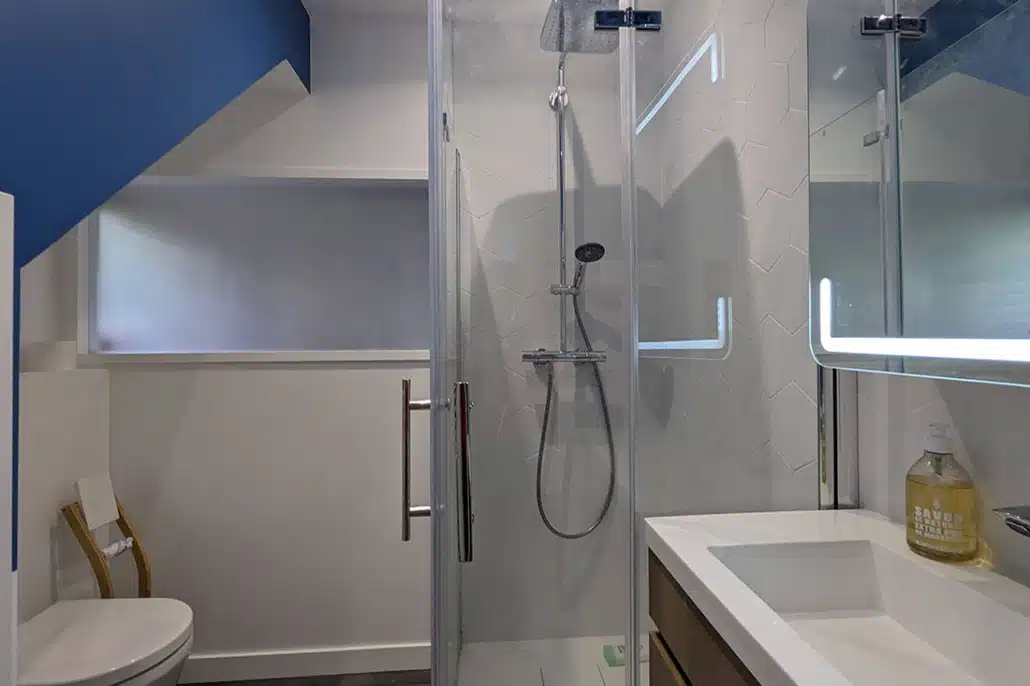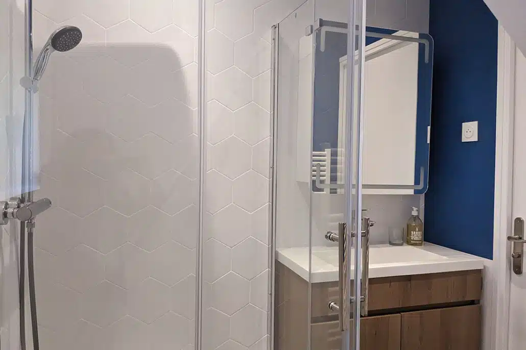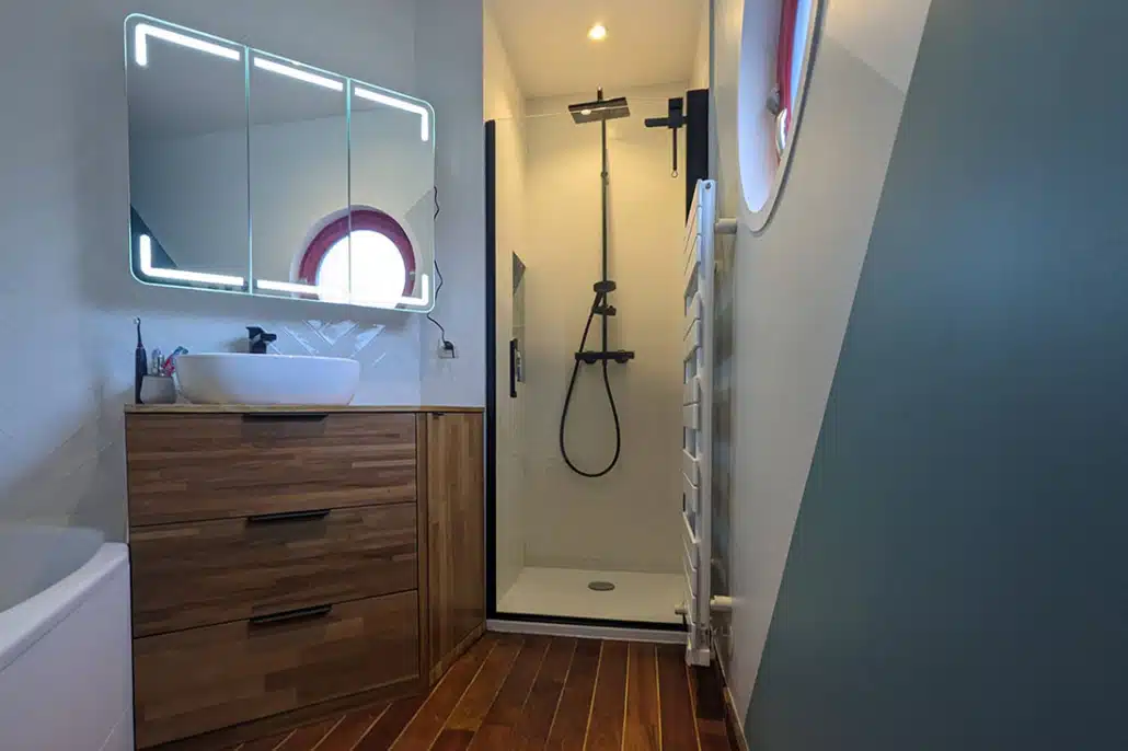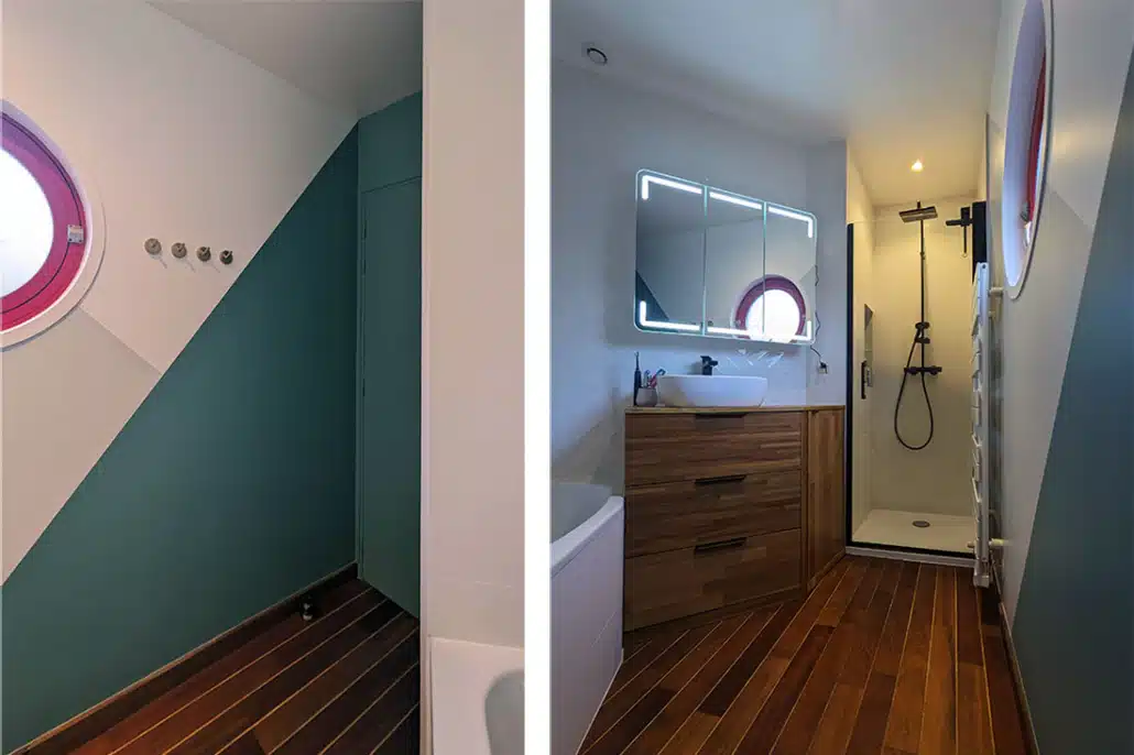 • La salle de bains est modernisée avec des jeux de couleur et de faïence murale. Elle est également optimisée avec un meuble sur mesure sous la vasque, une niche carrelée dans la douche et une baignoire qui épouse l’angle biscornu de la pièce.