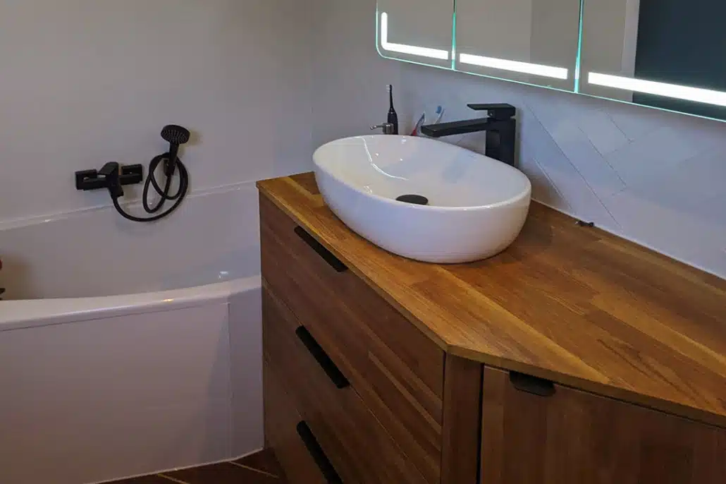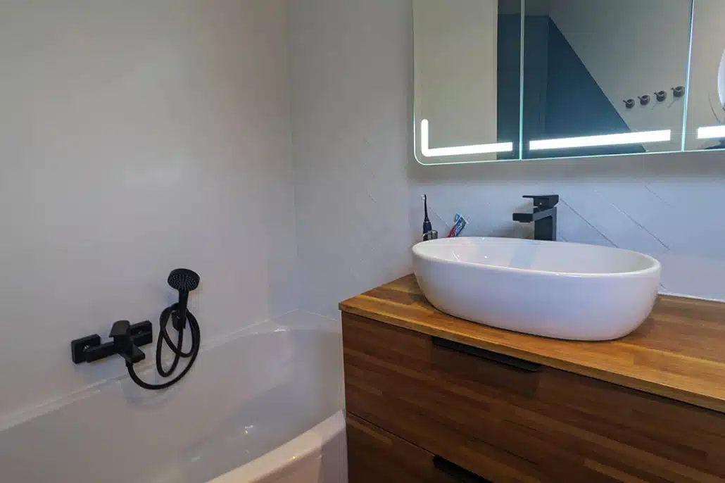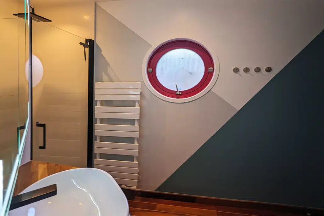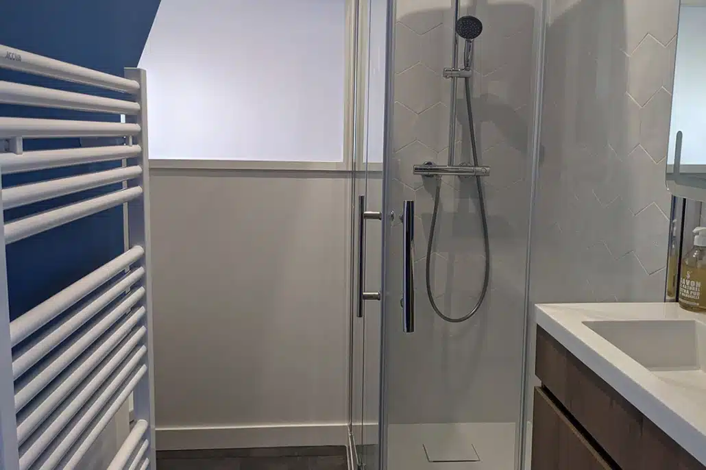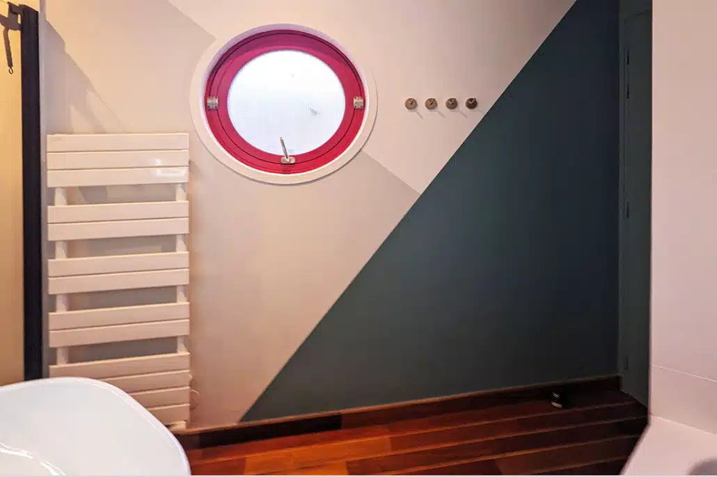 • La salle de bains est modernisée avec des jeux de couleur et de faïence murale. Elle est également optimisée avec un meuble sur mesure sous la vasque, une niche carrelée dans la douche et une baignoire qui épouse l’angle biscornu de la pièce.