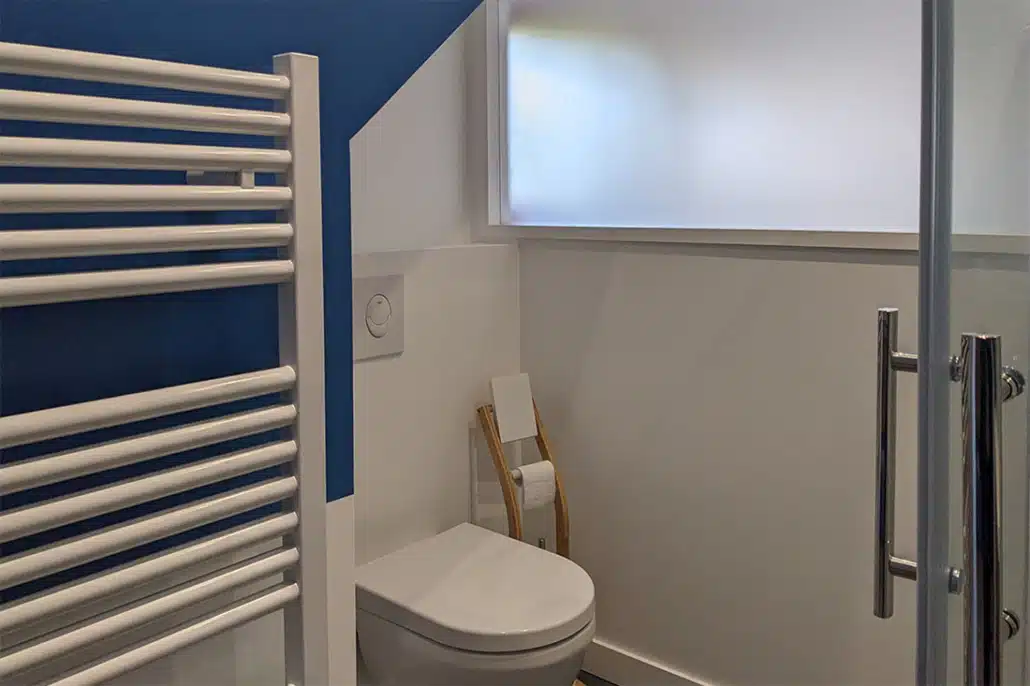 • L’annexe, avec bureau et chambre d’amis possèdera  sa propre salle de douche avec WC, toujours les effets de peinture et de faïence mural pour moderniser.