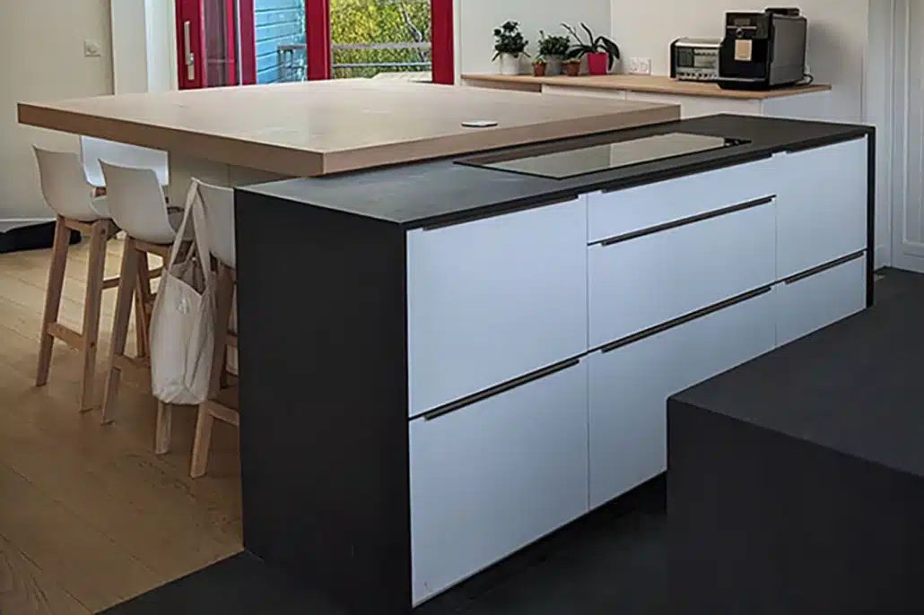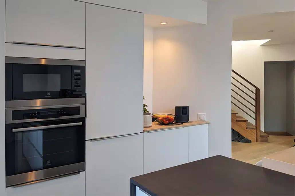 • Ils souhaitent un espace cuisine/séjour lumineux et très épuré afin que le regard soit attiré par l’extérieur et mettre ainsi en valeur les perspectives sur le jardin.