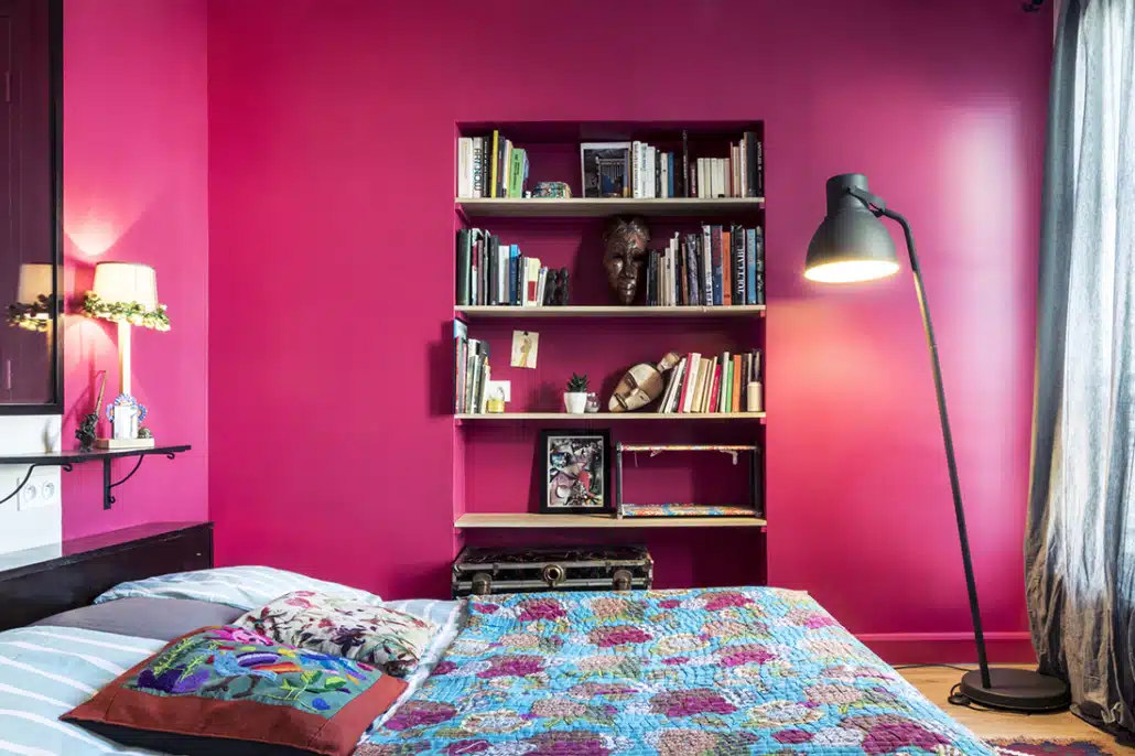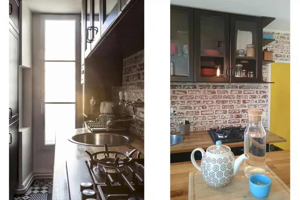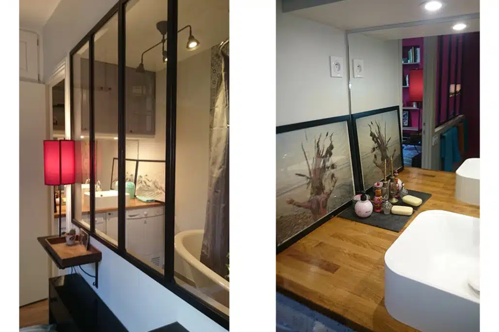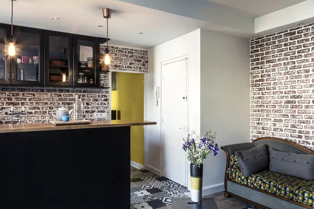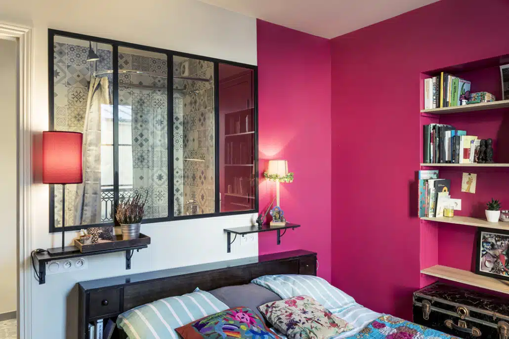 A présent, un mur de brique rénové contribue à donner un effet loft, une verrière sépare la chambre de la salle de bain et des perspectives colorées traversent l’appartement.
