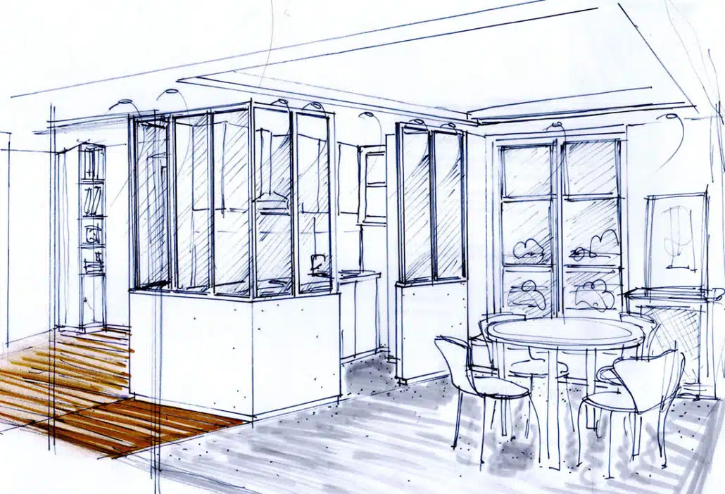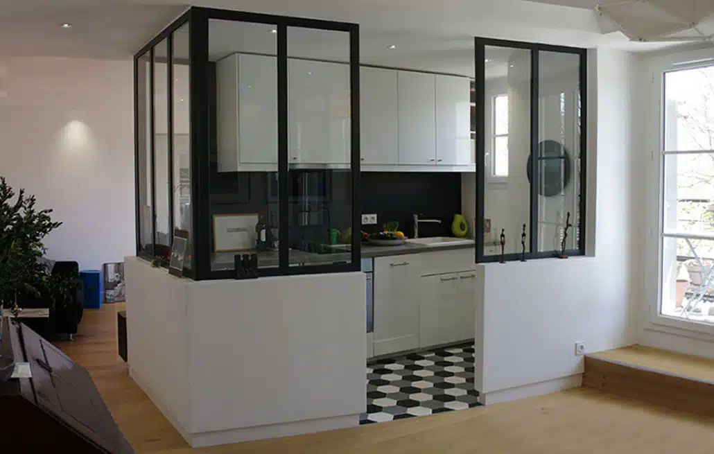 Nous décidons de partir sur un projet de verrière semi-ouverte, permettant à la fois de cloisonner la cuisine tout en la laissant ouverte et lumineuse.