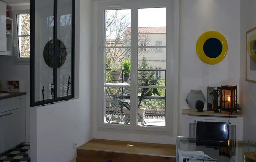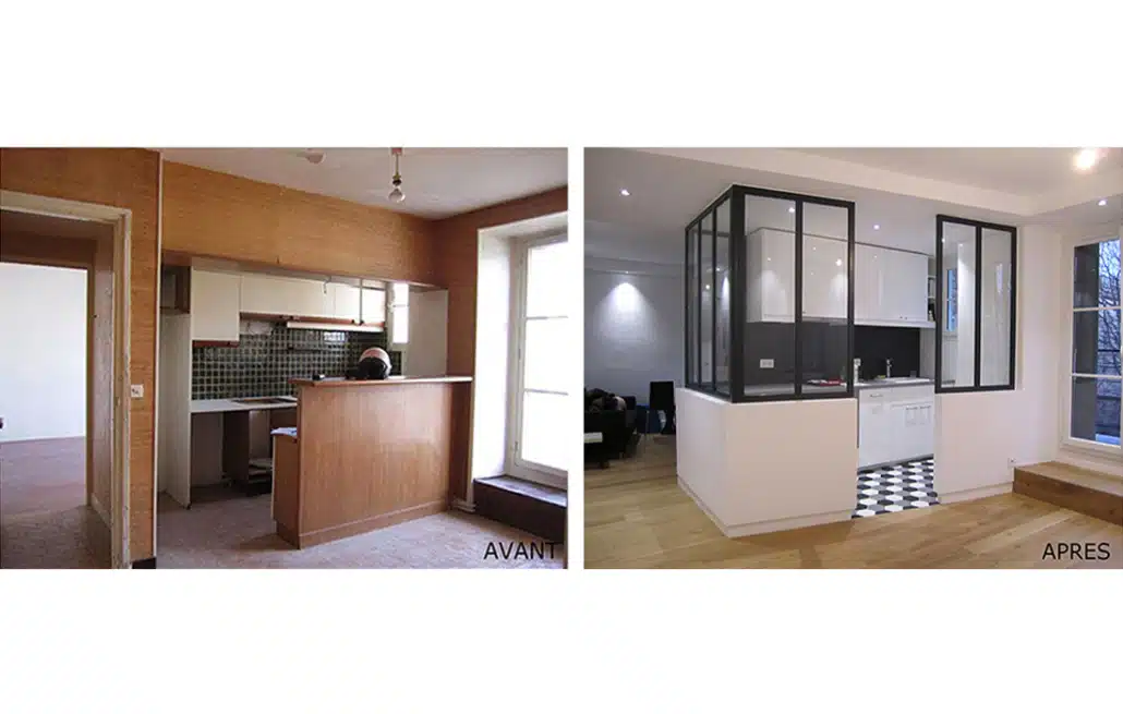 Outre certains aspects techniques (mise aux normes électriques, amélioration de l’isolation thermique et phonique, traitement des fissures, redressement du plancher), un des points majeurs consiste à créer une cuisine, à la fois aérée, intégrée entre l’espace salon et salle à manger.